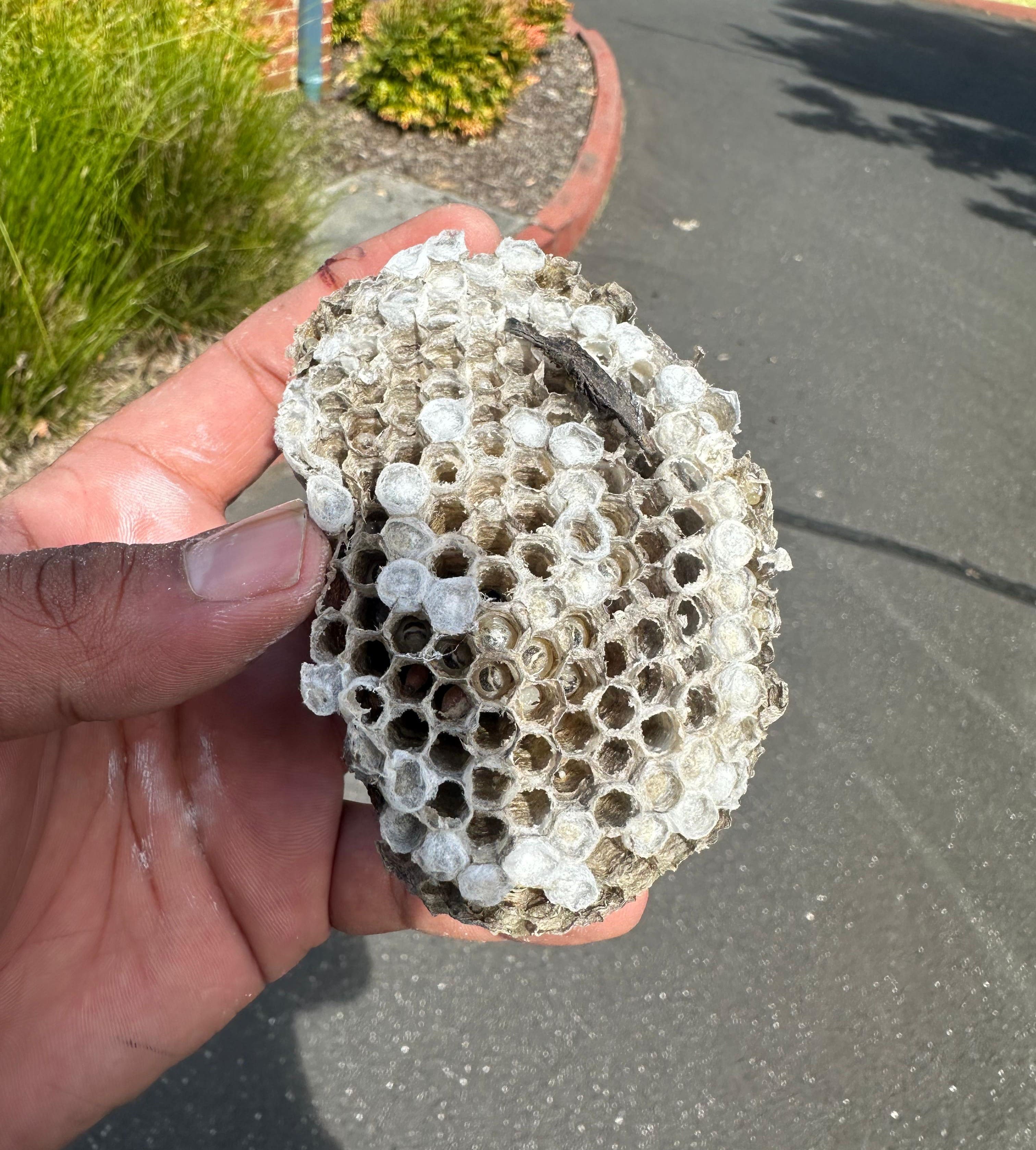 You may spot papery nests under eaves, roof corners, fences, trees, or sheds. Nests start small but can quickly expand to house hundreds of wasps.