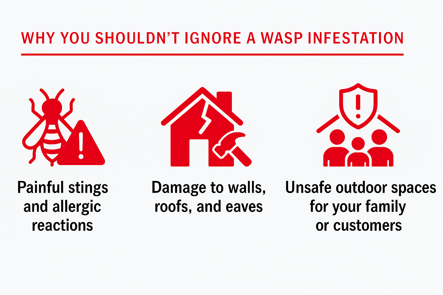 A wasp infestation near your home or business can cause anxiety, fear, and disruption, preventing people from using outdoor areas safely.